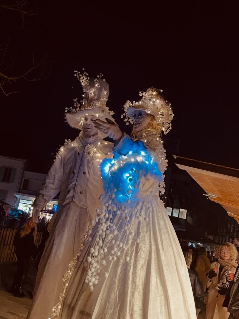 Sous les dorures et scintillements de leurs habits, ces personnages mystérieux et lumineux font naître la neige autour d’eux, comme par enchantement. Ils flottent gracieusement dans l’air, portés par des échasses qui leur permettent de dominer l’espace, laissant derrière eux un sillage de lumière et de poésie.